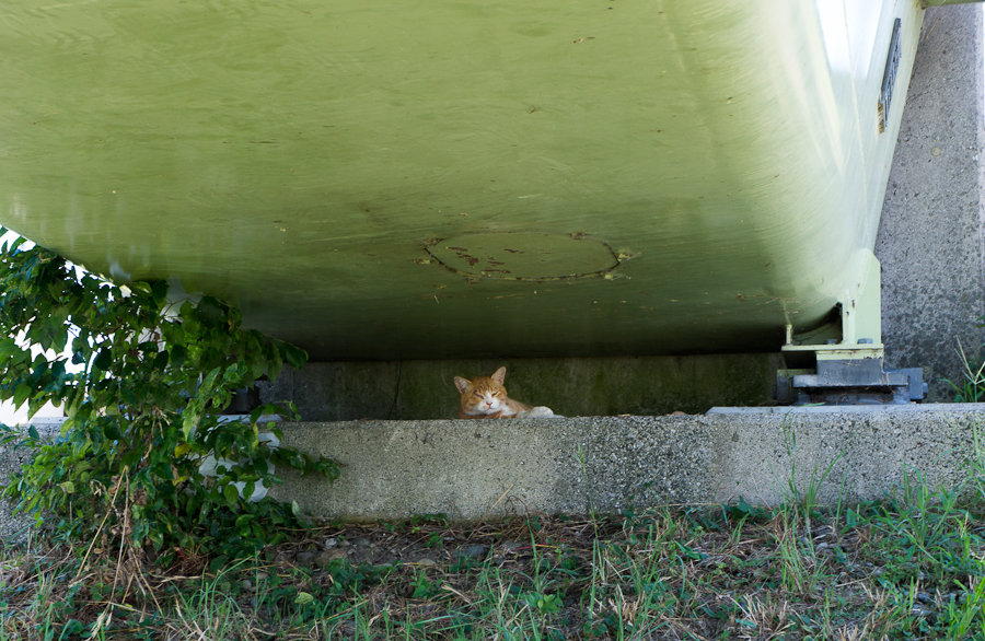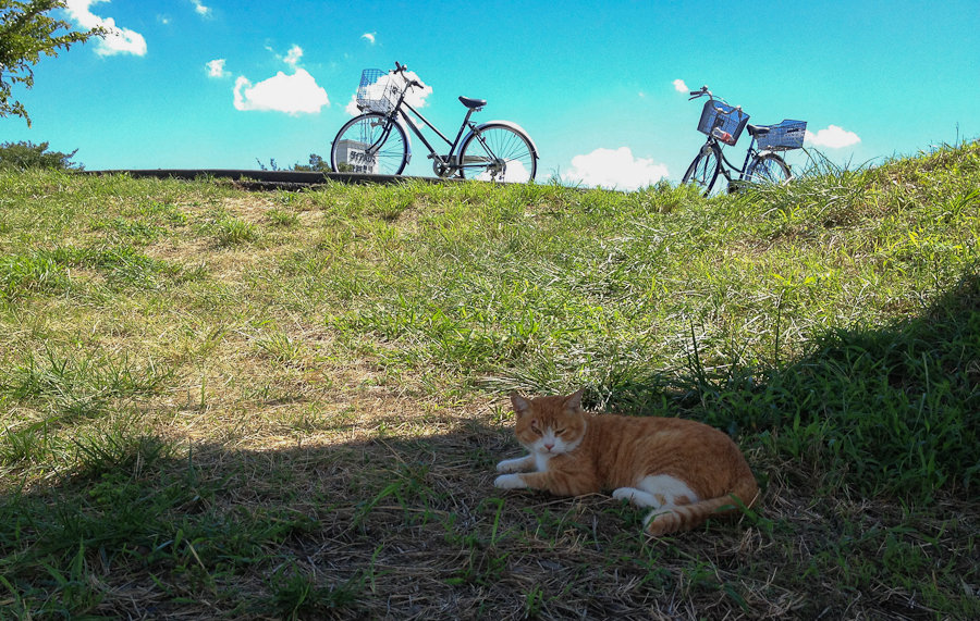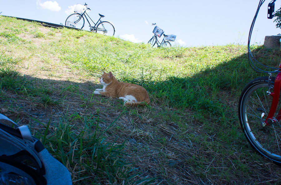 さて弁当でも……夏の直射日光下で食うのはツライと、橋の下にチャリと共に移動。どうやらニャンコ先生のお住まいのようで、ちょっと軒先貸してくださいね。