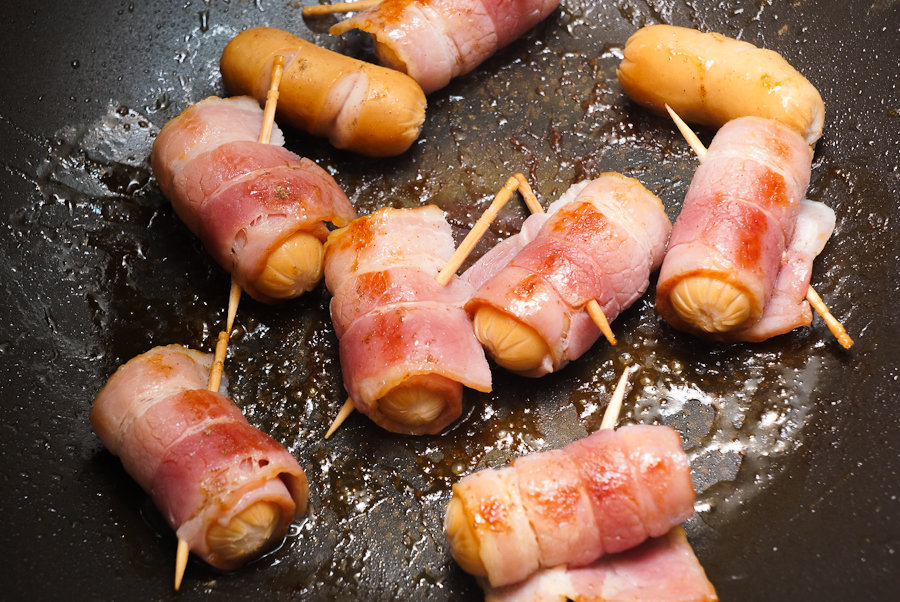 さっそく始発!! の前に、急に思い立ってお弁当を用意。秘儀、ウインナーの焼き過ぎベーコン巻錬成!!(小学生の遠足か)。