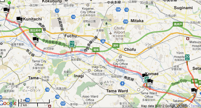 呼び名はともかく行ってみましょう。とりあえずサイクリングロードと言っても登りは嫌なので、上陸から下流へのルートを模索。いきなり青梅とか行ってしまうのも怖いし、始発点付近はイマイチ走りにくいらしいので、「まあ立川あたりでいいか」と適当に決定。輪行で立川駅までワープし、ずーっと川をくだって二子玉川あたりまで約25-30kmくらいを走ってみることにしました