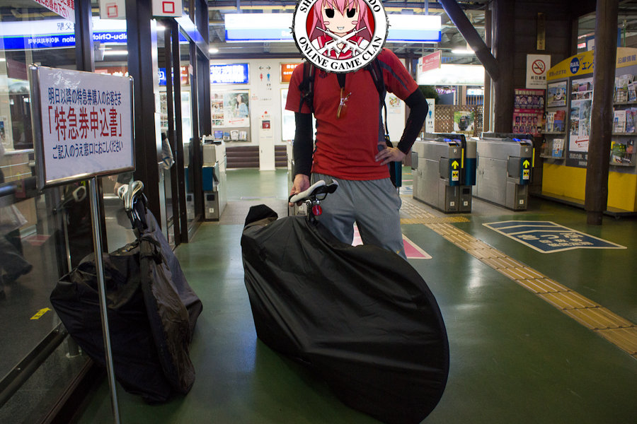 さすがにこの時間から、再び峠を超えて東京に戻ると、我々の実力では間違いなく即死ですので、今回は大人しく輪行で帰宅。のんれす氏も、実は輪行袋を購入しており、今回が初の実践。手間取っていましたが、なんとか収納していました。嘘です。フロントフォークが地面にモロ当たりしてました。あれが当たらないように前輪をフレームに固定しないとアカンのよ>のんれす