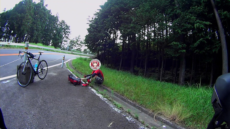 暑さに辟易としながらも、なんとかクランクを回して前に進みますが、キツイ登りを超えた後で休憩は必須。そもそも、テレビで「不必要な外出は自粛しましょう」的なアナウンスをされるレベルの殺人的な外気温の中でヒルクライムをやる事自体に無理があるのではという根本論が頭をよぎりますが、今更なげいても上り坂が下り坂になるわけではありません。