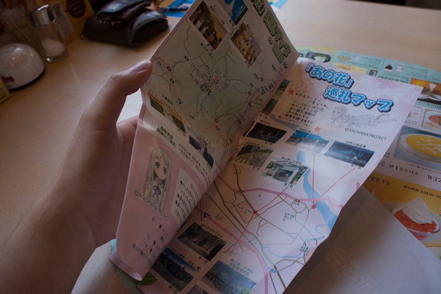 皆様ご覧ください、あの花マップが既にテーブルの上でしわくちゃです。もはや巡礼する気力ナッシンww