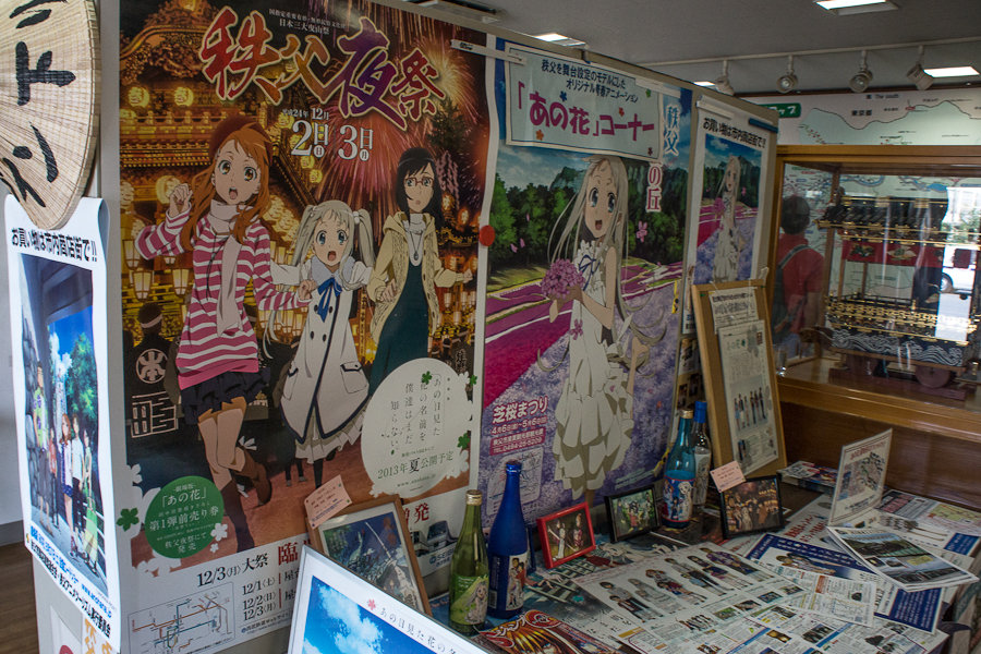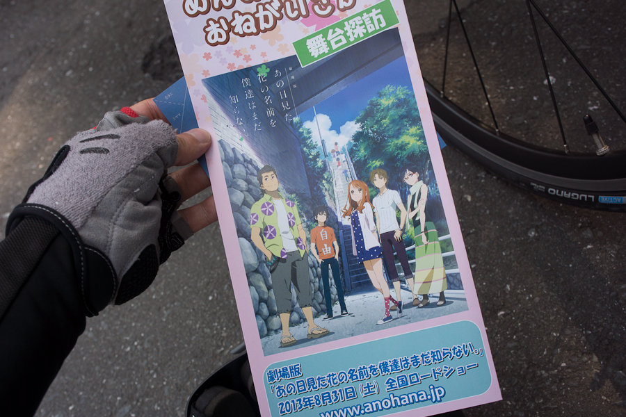 ……とサイコンには出ていますが、ぶっちゃけ暑さによる疲れで、体感消費カロリーは1,500kcalどころではないイメージ。食事処などで冷たいものでも飲んで、ゆっくり何か食べたいですが、その前に観光案内所で「あの花」巡礼マップをゲットせねば。