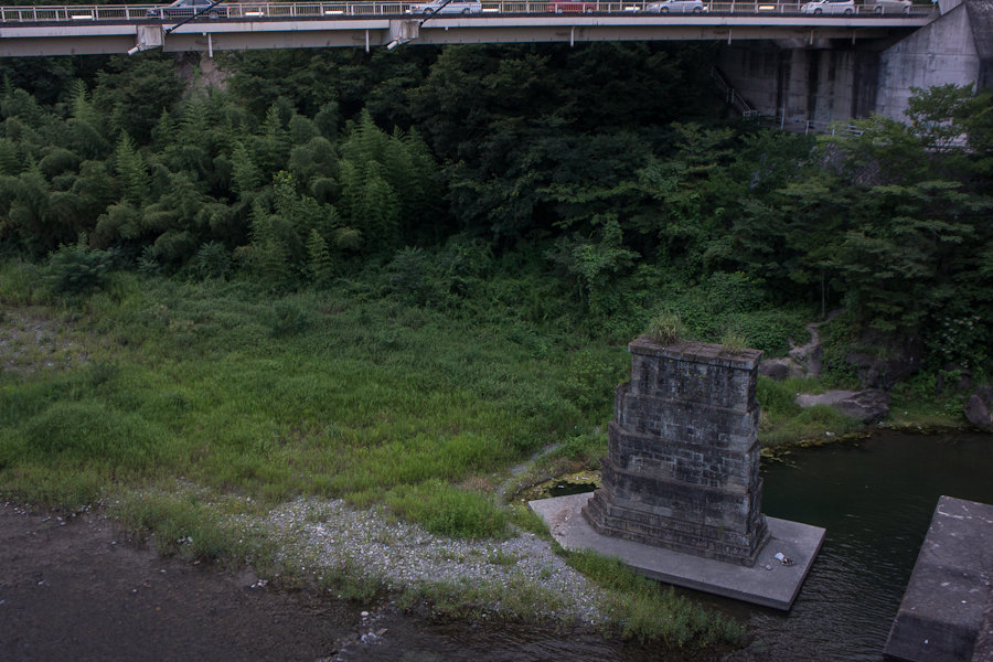 さらに秩父コンシェルジュ氏が、橋の下を見てごらんと指差します。そこには、橋の橋脚だけが幾つか残っています。氏によれば、古い橋のさらに昔に掛かっていた橋の名残で、現在は橋脚だけが残されているそうな。ラスト付近で、ここにめんまが降りて、じんたんが慌てて森を抜けて川岸に降りるシーンがありますが、それがまさにこの場所らしいです。
