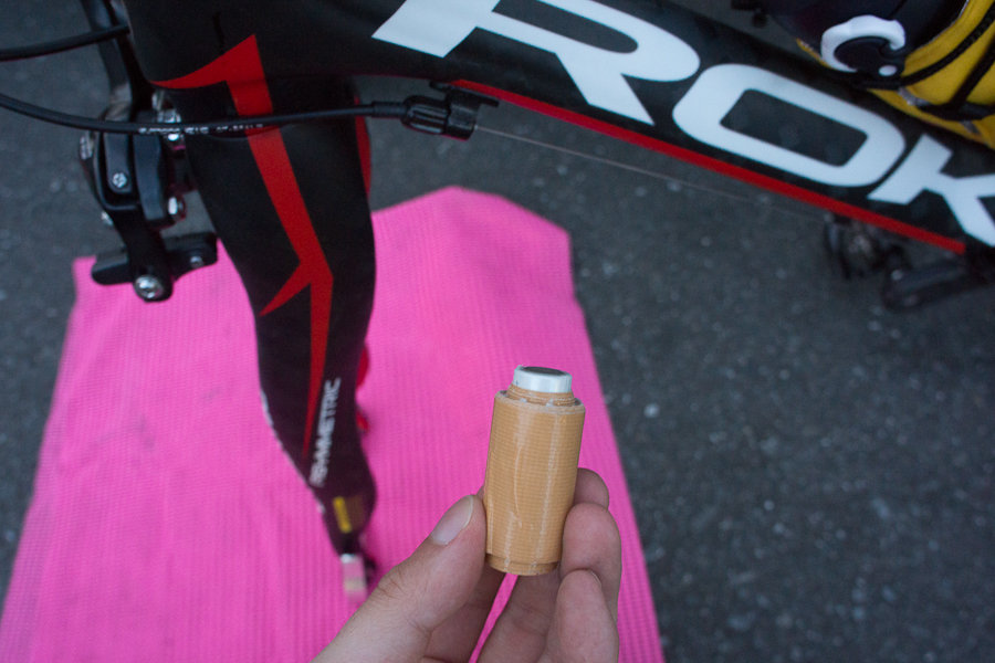 この際、ガムテですべり止めを固定しますが、荷物の軽量化のため、単3予備電池に必要な分のガムテだけ巻きつけて、トップチューブバッグに入れてあります。べんり!! ガムテは万が一タイヤが裂けた時も、裏から補強すれば走れるらしいので命綱としても頼もしい存在です。