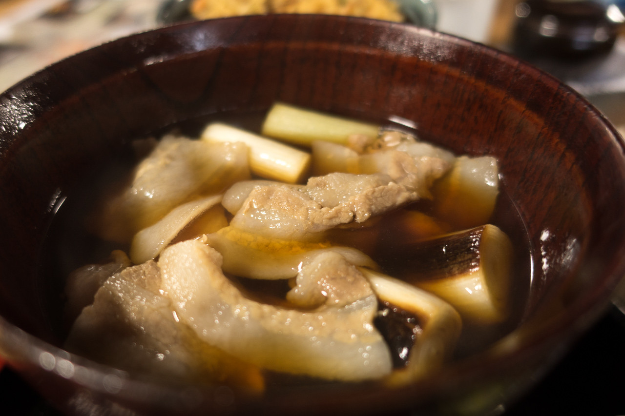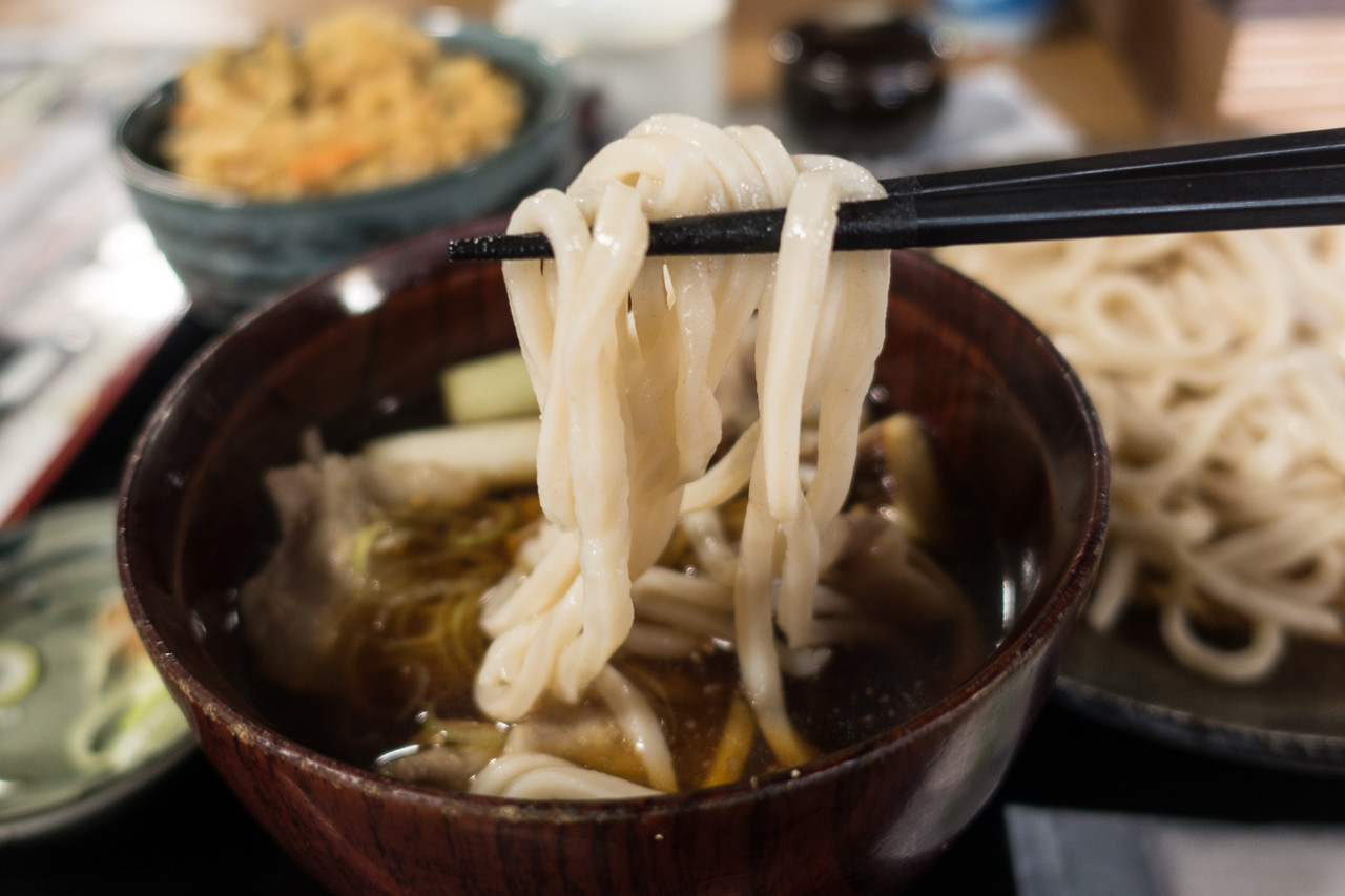 コシのあるうどんに、豚肉の旨味が良く出たつけ汁がマッチ。武蔵野うどんにも似た、野趣あふれる美味しさが、ヒルクラに疲れた体に染み渡ります。