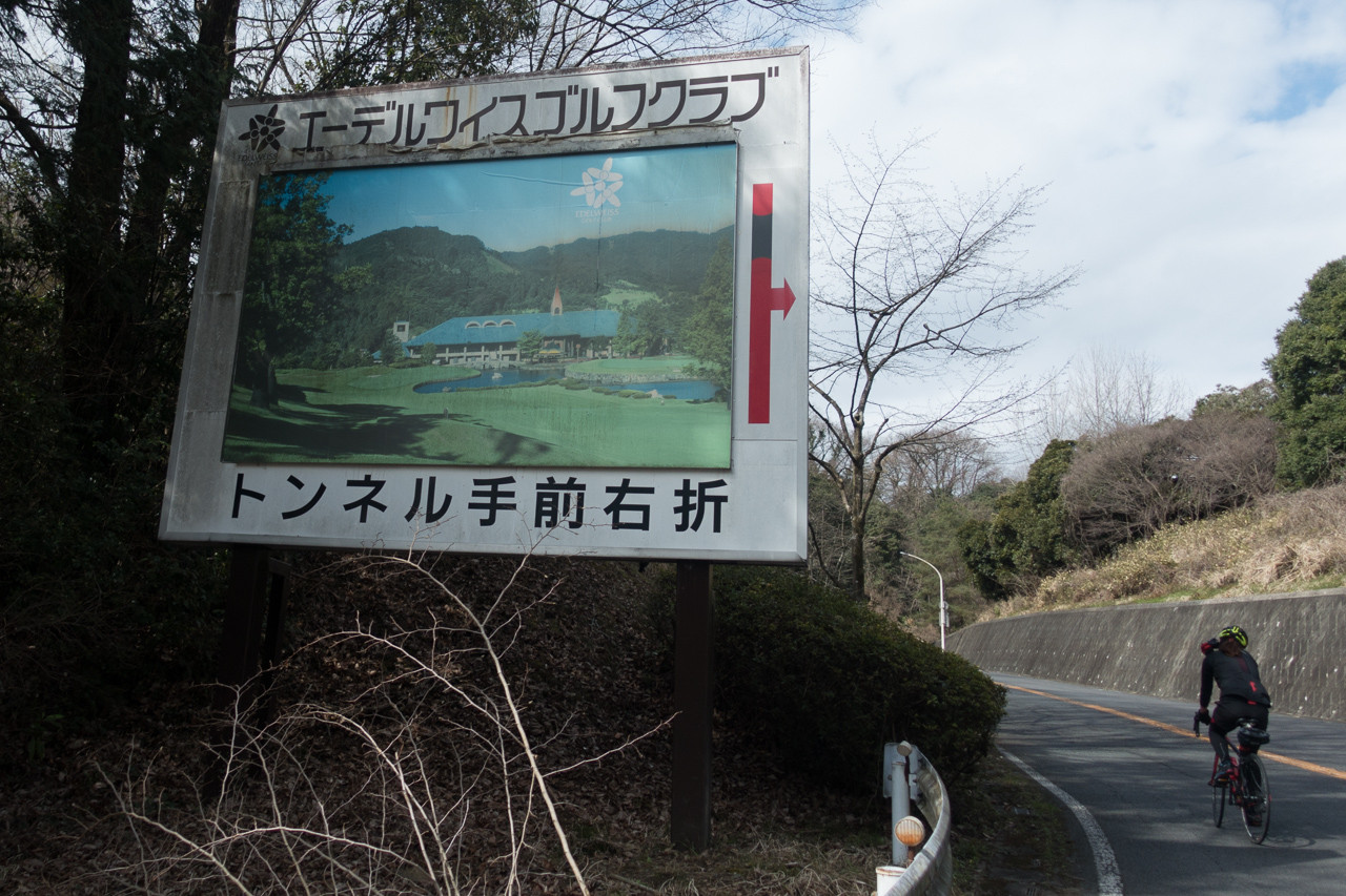 しばしのダウンヒルの後、また斜度がアップ。それも再び15%程度の激烈な坂です。苦痛にあえぎながら、ふと視界の端に「さいたまゴルフクラブ」の看板。ヒーヒー言いながらクリアして先に進むと、また激坂。酸素を求めて顔をあげると、「エーデルワイスゴルフクラブ」の看板……