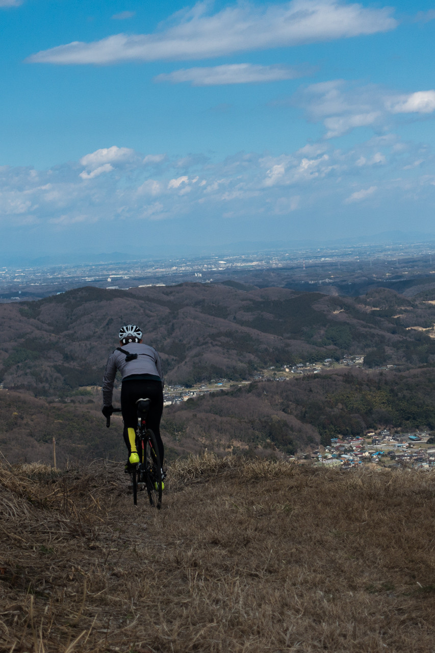 頂上の草むらを走るローディー。背景の山と、地面の草をズームで圧縮して切り取ると